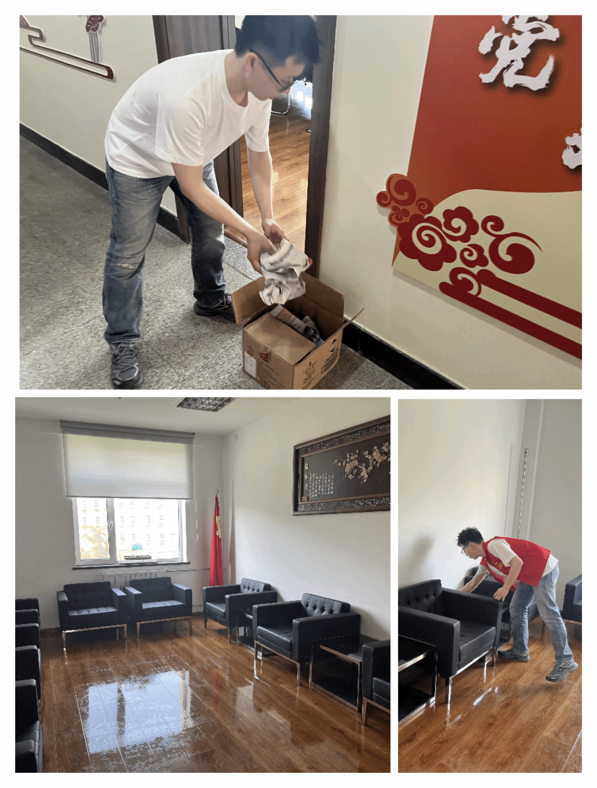 本次参与志愿服务活动的同学们分成三组,分别负责学院会议室、会客室等办公区域的物品整理、卫生清扫任务,以及协助学校档案馆老师完成档案整理工作。